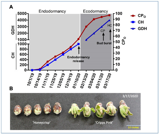 Accumulation of chilling hours (CH), chilling portions (CPO), and growing degree hours (GDH) in ‘Honeycrisp’ (HC) and ‘Cripps Pink’ (CP). Accumulation of CH, GDH, CPO, and major events are shown with arrows (A). An image showing HC and CP flower buds collected on the same day (B). The CH accumulation started on October 2019 reaching 20 CH (2 CPO) on 10/14/2019.