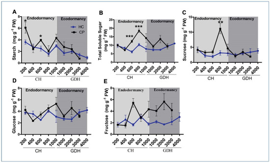 Starch (A), total soluble sugar (B), sucrose (C), glucose (D) and fructose (E) levels in two apple cultivars ‘Honeycrisp’ (HC) and ‘Cripps Pink’ (CP). Bud samples were collected from endodormancy induction to the bud break stage. The 200, 400, 600, 800, 1000 CH and 1000, 2000, 3000, and 4000 GDH corresponds to 11/11, 11/25, 12/05, 12/19, 1/10, 2/13, 03/04, 03/11, 03/17 dates in 2019–2020 respectively. Each point represents mean ± SEM of three biological replicates; p-value indicates comparison between ‘Honeycrisp’ and ‘Cripps Pink’ (* p < 0.05, ** p < 0.01, *** p < 0.001) using students t-test.