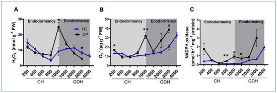 The level of superoxide (O2•−) in both cultivars showed a general increase from the beginning of endodormancy to budburst (Figure 3B). In ‘Honeycrisp’, the O2•− level remained between 10 and 12 µg g−1 during endodormancy, and increased gradually during ecodormancy, reaching its highest level of 30 µg g−1 at budburst. In ‘Cripps Pink’, O2•− showed no significant changes at the early stages of endodormancy (400−800 CH), followed by a dramatic increase at 1000 CH and a dramatic decrease at 1000 GDH. The levels of O2•− increased again with the progression of ecodormancy reaching its peak of 40 µg g−1 at budburst.