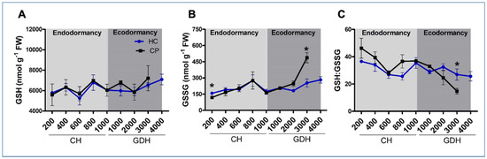 Changes in reduced glutathione, GSH (A), glutathione disulfide, GSSG (B) contents, and reduced to oxidized glutathione, GSH: GSSG (C) in two apple cultivars, ‘Honeycrisp’ (HC) and ‘Cripps Pink’ (CP) from the time of endodormancy induction to the bud break stage. Each point represents mean ± SEM of three biological replicates; p-value indicates comparison between ‘Honeycrisp’ and ‘Cripps Pink’ (* p < 0.05) using students t-test.