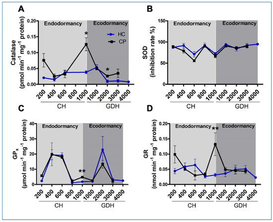 The enzymatic activities of catalase (A), superoxide dismutase, SOD (B), glutathione peroxidase, GPx (C) and glutathione reductase, GR (D) in two apple cultivars ‘Honeycrisp’ and ‘Cripps Pink’. Bud samples were collected from endodormancy induction to the bud break stage. Each point represents mean ± SEM of three biological replicates; p-value indicates comparison between ‘Honeycrisp’ and ‘Cripps Pink’ (* p < 0.05, ** p < 0.01,) using students t-test.