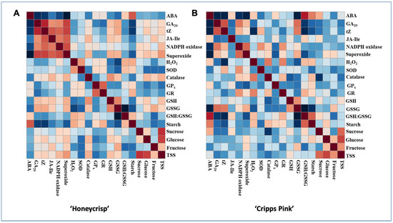ABA correlated significantly with trans-zeatin (−0.62, −0.69), starch (0.66, 0.57), NADPH oxidase (−0.55, −0.61), superoxide (−0.80, −0.71), and GSSG (−0.44, −0.73) in ‘Honeycrisp’ and ‘Cripps Pink’ respectively but no significant correlation was observed between H2O2 and ABA. ABA positively correlated with starch, but negatively correlated with the other molecules in both cultivars (Figure 6).