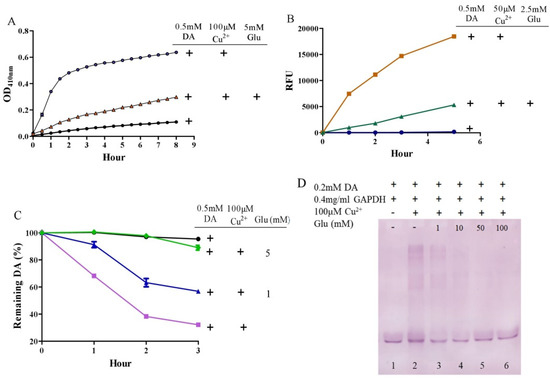 Glutamate protects against copper-induced dopamine oxidation. (A) Dopamine oxidation measured by OD410 nm. (B) Hydroxyl radicals detected by 3-CCA. (C) Dopamine levels detected by HPLC. (D) Dopamine-caused quinoprotein in GAPDH. Chemicals were mixed in 0.15 M PBS (pH 7.4) and incubated at 37 °C for indicated time or 20 min for D. Data are presented as mean ± range (n = 2). Note: DA: Dopamine, Glu: Glutamate.