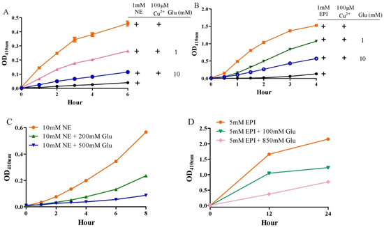 Since about 20% of copper is stored in the nucleus and copper is an essential component of chromatin [76], DNA is the primary target of copper/catecholamine-derived hydroxyl radicals [55]. As shown in Figure 4A, where lane 1 was the DNA prototype, 100 μM of dopamine perhaps had a weak damage effect (lane 2), and copper alone did not damage the DNA (lane 3). Dopamine-induced DNA damage was aggravated by copper in a dose-dependent manner (lane 6, 4). Specifically, while 10 μM of copper only initiated secondary DNA damage (lane 6), DNA degradation was almost completed by 25 μM of copper (lane 4). Under these conditions, −2.5 and 10 mM of glutamate, respectively, effectively inhibited the DNA damage (lane 7, 5). Similarly, when the dopamine was replaced with the same dose of norepinephrine or epinephrine (100 μM), copper was again found to promote DNA damage (Figure 4B, lane 2, and Figure 4C, lane 3). Again, glutamate dose-dependently inhibited the DNA damage (Figure 4B,C) and 10 mM of glutamate nearly completely inhibited the DNA damage (Figure 4B, lane 4, and Figure 4C, lane 6). The protective role of glutamate on dopamine/copper-triggered DNA damage could be attributed to the inhibitory effect of glutamate on copper-promoted dopamine oxidation, as demonstrated above. We thus inferred that the protective role of glutamate on norepinephrine or epinephrine/copper-triggered DNA damage is also associated with the inhibitory effect of glutamate on copper-promoted norepinephrine or epinephrine oxidation. This was validated by our next experiment. Copper at a level of 100 μM greatly promoted the oxidation of 1 mM of norepinephrine or epinephrine, as assessed by OD410nm (Figure 5A,B); however, as little as 10 mM of glutamate substantially suppressed the copper-mediated oxidation of the catecholamine (Figure 5A,B). Since the “autoxidation” of catecholamines should be iterated as the “trace transition metal-mediated oxidation” of catecholamines, and glutamate can restrain the “autoxidation” of dopamine by depriving the redox activity of copper, we thus hypothesized that glutamate ought to prevent norepinephrine or epinephrine from undergoing so-called autoxidation. Indeed, the oxidation of both norepinephrine (10 mM) (Figure 5C) and epinephrine (5 mM) (Figure 5D), as assessed by OD410nm, increased as a function of time; however, this was nearly completely inhibited by 500 mM and 850 mM of glutamate, respectively, according to the results shown in Figure 5C,D.