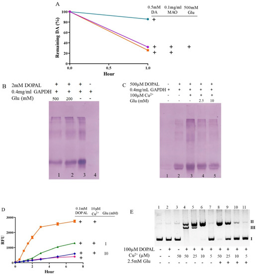 MAO [77] catalyzes the oxidative deamination of dopamine to form DOPAL, which is then oxidized to DOPAL-quinone [78,79]. DOPAL, as the critical endogenous toxin causing dopaminergic neuron loss in Parkinson’s disease, is 1000-fold more toxic than dopamine in vivo [80]. DOPAL-induced protein modifications were enhanced by copper [81]. Oxidatively damaged DNA, caused by catecholamine-related neurotoxins, contributes to neuronal death [26]. Although glutamate could not inhibit the MAO-mediated oxidation of dopamine (Figure 6A), it was able to powerfully inhibit DOPAL-induced quinoproteins (Figure 6B), DOPAL/copper-enhanced quinoprotein formation (Figure 6C), and DOPAL/copper-produced hydroxyl radicals (Figure 6D). The copper-mediated oxidative toxicity of DOPAL was also observed in DNA. As shown in Figure 6E, DOPAL and copper alone did not damage the DNA (lanes 1–3). However, when 100 µM of DOPAL was added together with different concentrations of copper, copper-dependent DNA damage was observed: secondary damage with 10 μM of copper (lane 6) and tertiary damage with 25 and 50 μM of copper (lane 5 and 4, respectively). A protective effect of 2.5 mM of glutamate against copper-enhanced DOPAL damage to DNA was consistently observed at all the copper concentrations examined (lanes 10 vs. 6; lanes 9 vs. 5; lanes 8 vs. 4).