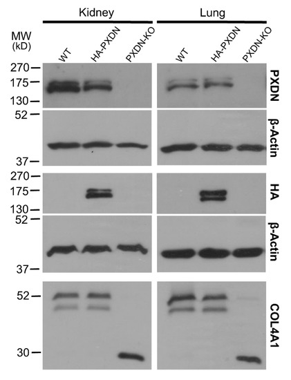 To facilitate the investigation of PXDN’s localization and function in mouse tissues and cells, we have developed a knock-in (KI) animal model, where we introduced a hemagglutinin (HA) epitope tag-encoding nucleotide sequence into the mouse PXDN gene, using the CRISPR/Cas9 technique [15]. We modified the PXDN gene to contain the hemagglutinin-tag at the N-terminus of the encoded protein, following the secretory signal. We hypothesized that if proteolysis of PXDN’s C-terminus also occurs in vivo, then we would detect two HA-tagged protein products with different molecular weights. As shown in Figure 1, we observed two bands with slightly different molecular weights in the kidney and lung. Double PXDN signals, with a slight difference in molecular weights, were also detected by using a polyclonal PXDN-specific antibody (Figure 1).