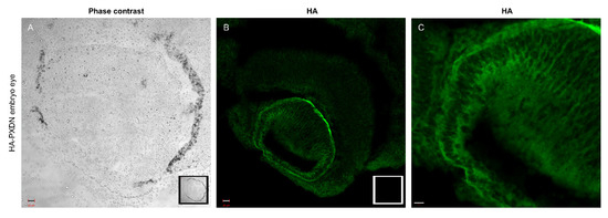 Immunostaining of PXDN in mouse embryo eye. (A) Phase contrast picture was taken with a 20× objective of an embryo eye prepared from HA-PXDN knock-in mouse. In the right corner of the picture, the inserted photo is made of a WT embryo eye. Bar indicates 20 µm. (B) Immunofluorescent staining of HA-PXDN with HA-specific antibody shows specific labeling in the developing lens, around the cells, and in basement membrane-like structure. In the right corner of the picture, the inserted photo is made of a WT embryo eye, where there is no specific signal. Bar indicates 20 µm. (C) Higher magnification with 40× objective of the immunostained HA-PXDN embryo eye, even more highlighting the details of the HA signal’s localization in the developing lens. Bar indicates 10 µm.