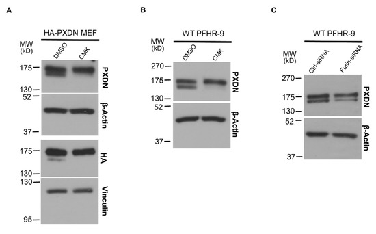 The effect of proprotein-convertase inhibitor and furin-specific siRNA treatment in cell culture. (A) Mouse embryonic fibroblasts (MEFs) prepared from HA-PXDN embryo were treated with furin inhibitor CMK or with the inhibitor’s solvent DMSO. The CMK treatment significantly reduced the intensity of the lower band, which represents the cleaved form of PXDN. (B) Treatment of WT PFHR-9 with CMK shows the same result, the inhibitor reduced the proteolytic processing of PXDN. (C) Treatment of WT PFHR-9 with furin-specific siRNA confirmed the role of furin in the proteolytic cleavage of PXDN.