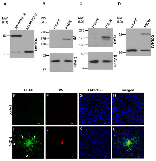 HA-tag (C29F4) rabbit monoclonal antibody was obtained from Cell Signaling Technology (Danvers, MA, USA), and we used it in Western blot analysis. V5-tag mouse monoclonal antibody was purchased from AbD Serotec (Raleigh, NC, USA), and we used it in Western blot experiments, and we used an anti-V5 Epitope tag rabbit polyclonal antibody (Sigma-Aldrich, St. Louis, MO, USA, AB3792) in immunostaining experiments. Monoclonal Anti-FLAG M2 antibody produced in mouse (Sigma-Aldrich, F3165-1MG) was applied in both Western blot and immunostaining procedures. Anti-β-actin or anti-vinculin mouse monoclonal antibody (Sigma-Aldrich) was used to detect loading controls in the Western blot experiments. Anti-Human α1(IV) NC1 clone H11 (Chondrex, Woodinville, WA, USA) was also used in Western blot analysis. A mouse, anti-PXDN polyclonal antibody was raised by immunizing mice with a GST-fusion protein containing a 181 amino acids long fragment (aa 428-609) of the mouse PXDN protein.