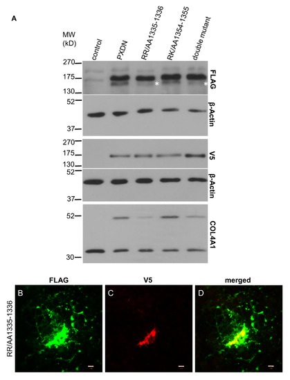 Investigation of the target sites for PXDN’s proteolysis. (A) Western blot analysis of PXDN-deficient cells transfected with the double-tagged WT PXDN or with different mutated PXDN constructs. In cells transfected with the RR/AA1335-1336 and the double mutant PXDN constructs, we can observe the decreased intensity of the lower band (marked by asterisks). On the lowest panel, we can observe that the RR/AA1335-1336 mutation inhibits the crosslinking activity of PXDN. (B–D) Immunofluorescent staining of RR/AA1335-1336 PXDN-transfected cells shows cell-associated and extracellular FLAG signal (green) (B). The V5 signal (red) appears intracellularly (C). The merged picture (D) demonstrates that the cell-associated FLAG- and V5 signals are partially colocalized. The bar indicates 10 µm.