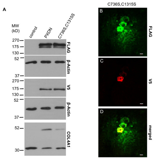Using the CRISPR/Cas9 system, we previously created a PXDN-deficient PFHR-9 cell line [16]. PXDN-deficient cells fail to form crosslinks between NC1 domains, as demonstrated by the absence of NC1 dimers in the collagenase lysates of PXDN-deficient cells, detected by an NC1-specific antibody (Figure 4A). The PXDN KO cell line offered a promising tool to gain further information about the proteolytic processing of PXDN. We designed a PXDN construct where the encoded protein was labeled by a FLAG-tag at the N-terminus (following the signal peptide), and the protein was also marked by a C-terminal V5-epitope. Designs of all PXDN constructs used in this paper are shown in Figure S1. We transfected this construct into PXDN-deficient PFHR-9 cells and detected PXDN expression with FLAG- and V5-specific antibodies, respectively. As shown in Figure 4B, the Western blot signal obtained with the anti-V5 antibody was a single band, while two bands were recognized by the anti-FLAG antibody (Figure 4C). This experiment confirmed that the proteolytic processing of the epitope-tagged PXDN also occurs in PFHR-9 cells. The heterologous expression of PXDN in KO cells restored collagen IV crosslinking (Figure 4D), proving that the double epitope-labeled PXDN is functional in PFHR-9 cells. Using this construct offered a potentially valuable experimental tool to study the post-translational processing and function of PXDN.