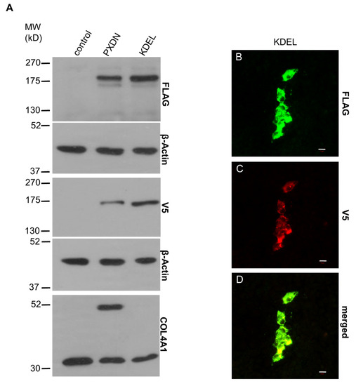 Characterization of the ER retention mutant PXDN. (A) Western blot analysis of the FLAG- and V5 signals of the ER retention mutant PXDN construct (KDEL) indicates reduced proteolytic processing of the protein. On the lowest blot, we can observe that the mutant protein’s collagen IV-crosslinking activity is essentially absent. (B–D) Immunostaining of the ER retention mutant PXDN transfected cells shows only cell-associated FLAG signal (green) (B). The V5 signal (red) also appears only in a cell-associated manner (C). The merged picture (D) shows the partial colocalization of the FLAG- and V5 signals. The bar indicates 10 µm.