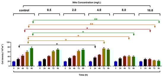 The growth curve of Heterosigma akashiwo exposed to NAs at different concentrations with different times. Data are expressed as mean ± SD. * and ** indicate statistical differences between the different NAs treatment groups at the same time, assessed according to one-way ANOVA and Dunnett’s T3 post hoc test (p < 0.05). * indicates p < 0.05. ** indicates p < 0.01.