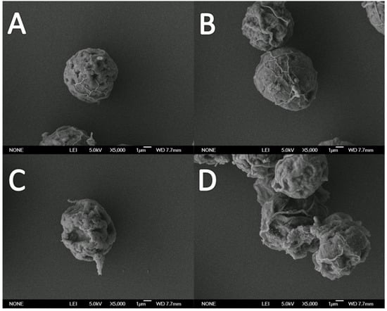 The SEM morphology of H. akashiwo exposed to NAs for 96 h. (A) The control at 0 h; (B) the control at 96 h; (C) H. akashiwo monomer; and (D) H. akashiwo aggregate exposed to 16 mg/L of NAs for 96 h.