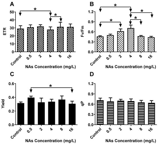 The changes in the ChlF parameters: (A) ETR, (B) Fv/Fm, (C) yield, and (D) qP of H. akashiwo exposed to NAs at different concentrations for 96 h. Data are expressed as mean ± SD. * indicates statistical differences between the different NAs treatment groups, evaluated according to one-way ANOVA and Dunnett’s T3 post hoc test (p < 0.05). * indicates p < 0.05.