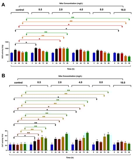 (A) The changes in the SOD of H. akashiwo exposed to NAs at different concentrations for 96 h. (B) The changes in the CAT of H. akashiwo exposed to NAs at different concentrations for 96 h. Data are expressed as mean ± SD. * and ** indicate statistical differences between the different NAs treatment groups at the same time, assessed according to one-way ANOVA and Dunnett’s T3 post hoc test (p < 0.05). * indicates p < 0.05. ** indicates p < 0.01.
