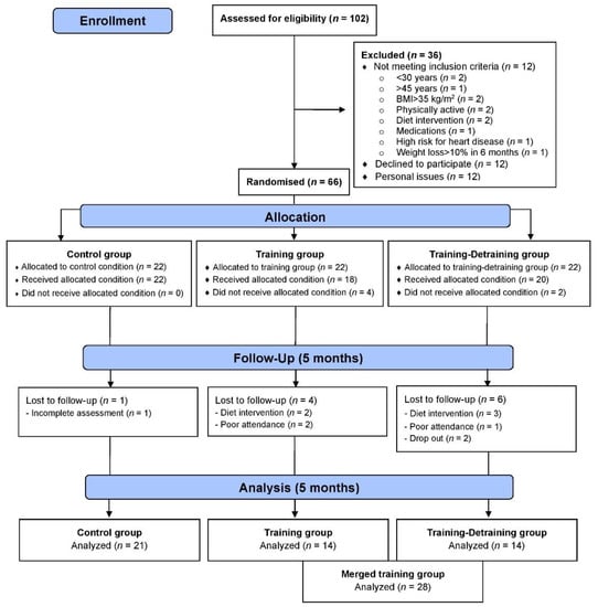This study is a part of a larger 10-month training-detraining randomized controlled trial (DoIT) based on a 3-group, repeated measures design in accordance with the Consolidated Standards of Reporting Trial (CONSORT) guidelines (Figure 1). DoIT trial was registered at clinicaltrials.gov as NCT03134781 and its purpose and methodology are reported elsewhere [25]. In this work, data upon secondary variables (cardiometabolic health, oxidative stress, and redox status) are presented. A preliminary power analysis (effect size >0.55, probability error of 0.05, 2-tailed alpha level, power of 0.9) using the G*Power 3.0.10 program revealed that a sample of 36–40 participants was necessary to identify statistically significant trial effects. Initially, 102 apparently healthy premenopausal women (30–45 years) with overweight and obesity were approached using fliers posted in the local community, social media and by word of mouth, and 66 were recruited. Randomization was attained by a random-numbers table (allocation sequence conducted by an independent researcher and was concealed until interventions were assigned).