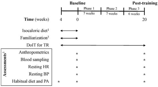 Habitual PA and caloric intake were assessed using procedures previously reported using 7-day accelerometry (GT3X+, ActiGraph, Pensacola, FL, USA) and 7-day diet recalls, respectively [25]. Diet recalls were analyzed by a dietitian for energy and macronutrient intake using a nutrition analysis software (Science Fit Diet 200A, Science Technologies, Athens, Greece). PA and caloric intake assessments were performed at baseline and after 5 months of training (Figure 2).