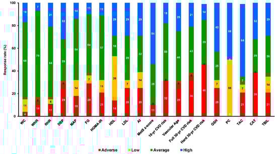 Multiple differential responder groups to exercise in TR following a 5-month intervention. AI: atherogenic index; CAT: catalase; CVD-10: 10-year cardiovascular disease risk; CVD-30: full 30-year cardiovascular disease risk; DBP: diastolic blood pressure; FG: fasting glucose; FI: fasting insulin; GSH: glutathione; HDL: high-density lipoprotein; HOMA-IR: homeostatic model assessment of insulin resistance; LDL: low-density lipoprotein; MAP: mean arterial pressure; PC: protein carbonyls; RHR: resting heart rate; SBP: systolic blood pressure; TAC: total antioxidant capacity; TBIL: total bilirubin; TC: total cholesterol; TG: triglycerides; VA: vascular age; WC: waist circumference; WHR: waist-to-hip ratio.