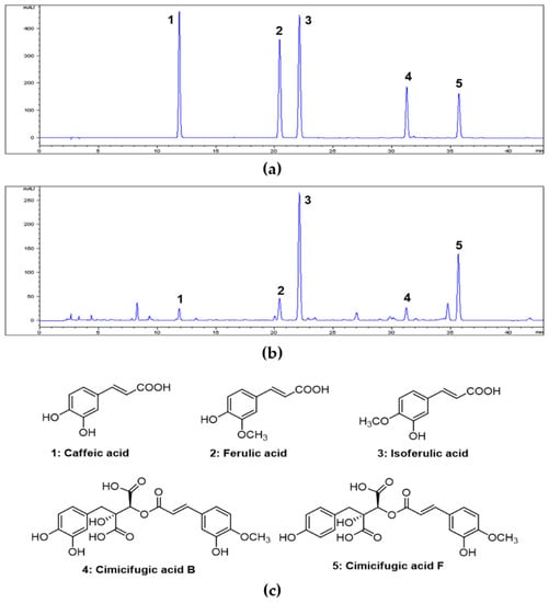 High-performance liquid chromatography (HPLC) chromatograms of five standard compound mixtures (a) and 70% ethanol extract of Cimicifugae Rhizoma (b). Chemical structures of five compounds (c). Peak identification: 1, caffeic acid; 2, ferulic acid; 3, isoferulic acid; 4, cimicifugic acid B; 5, cimicifugic acid F. Chromatographic conditions are described in the text. Detection was at 320 nm.