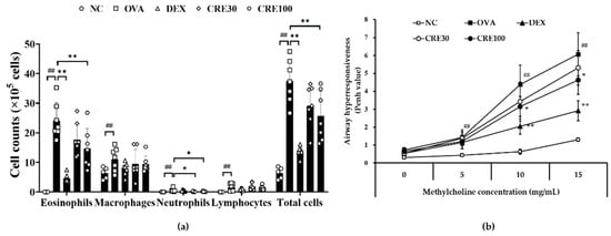AHR was noticeably elevated in the OVA group in comparison to the NC group (Figure 2b). However, CRE reduced AHR in animals with asthma by increasing the concentration of methylcholine. In particular, the CRE100 group revealed a marked decline in AHR as compared to the OVA group.