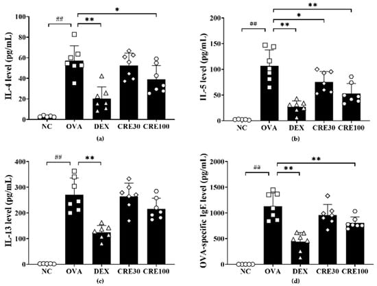 The OVA group exhibited marked elevations in IL-4, -5, and -13 levels in BALF as comparison to those in the NC group (Figure 3a, Figure 3b and Figure 3c, respectively). By contrast, the CRE-treated groups demonstrated a decrease in inflammatory cytokine levels in the BALF of animals with asthma. In particular, IL-4 and -5 levels in the BALF from the high-dose CRE group displayed significant reductions in comparison with those in the OVA group. OVA-specific IgE was also found to be more elevated in the OVA group than in the NC group (Figure 3d). CRE100 group markedly decreased the OVA-specific IgE in comparison to the OVA group.