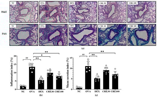 The OVA group revealed noticeable inflammatory cell recruitment in the peribronchial and perivascular lesions as compared to that in the NC group (Figure 4a,b). By contrast, the high-dose CRE group exhibited a decrease in the inflammatory responses of lung tissue as compared to that in the OVA group. Mucus secretion was conspicuously increased in the OVA group as compared to that in the NC group, whereas it was declined in the CRE groups as compared to that in the OVA group (Figure 4a,c).