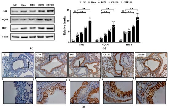The expression of Nrf2 and NQO1 was markedly decreased in the OVA group compared to that in the NC group (Figure 5a,b). By contrast, the CRE groups displayed significantly elevated expressions of Nrf2 and NQO1 as compared to that in the OVA group. In addition, HO-1 expression was markedly increased in the OVA group as compared to that in the NC group, whereas it was elevated in the CRE-treated groups as compared to that in the OVA group (Figure 5a–c).