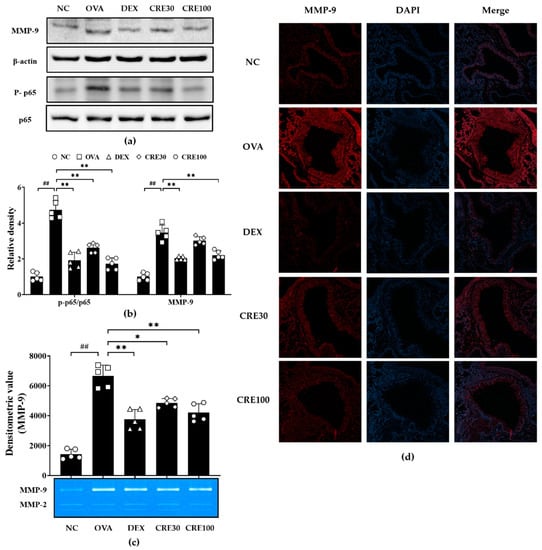 The OVA group revealed significantly elevated NF-κB phosphorylation in comparison with the NC group (Figure 6a,b). By contrast, the CRE groups displayed a noticeable reduction in phosphorylation of p65 as compared to that in the OVA group. The activity and expression of MMP-9 was markedly elevated in the OVA group as compared to that in the NC group (Figure 6a,c). By contrast, the CRE groups revealed a noticeable reduction in the expression and activity of MMP-9 as compared to that in the OVA group. Additionally, the reduction in MMP-9 induced by CRE treatment was also observed in histological examination. The OVA group revealed a noticeable elevation in MMP-9 expression in the lung tissue as compared to that in the NC group (Figure 6d). However, the CRE groups exhibited a significant decline in MMP-9 expression in the lung tissue as compared to that in the OVA group.