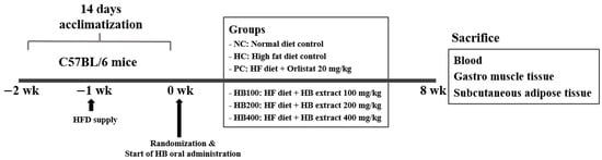Male C57BL/6 mice (six-week-old) were purchased from Orient Bio Co. Ltd. (Uiwang-si, Gyeonggi-do, Korea) and acclimated for one week under standard conditions (temperature of 20–25 °C, humidity of 50–55%, and a 12-h light-dark cycle) with free access to food and water ad libitum. After the acclimation period, mice were randomly divided into six groups (n = 8 per group): (1) NC, normal diet (10% calories from fat; D12450B; Research Diets, New Brunswick, NJ, USA) control; (2) HC, high-fat diet (45% calories from fat; D12451; Research Diets, New Brunswick, NJ, USA) control; (3) PC, high-fat diet with orlistat 20 mg, TCI, Tokyo, Japan); (4) HB100, high-fat diet with HB extract at 100 mg/kg; (5) HB200, high-fat diet with HB extract at 200 mg/kg; and (6) HB400, high-fat diet with HB extract at 400 mg/kg. NC and HC groups of mice were orally given 0.5% water solution of carboxymethyl cellulose sodium (CMC-Na, TCI, Tokyo, Japan) only, while PC and the three HB groups of mice were administrated with an equal volume of the suspended or dissolved test material in 0.5% CMC-Na solution once a day for eight weeks. Schedule of the animal experiment is shown in Figure 1. Body weight was measured once a week. All animals were cared and used in accordance with the guidelines of Gachon University for the care and use of laboratory animals (reference number: GIACUC-R2020009). After 12 h of fasting, all mice were anesthetized with CO2. Blood samples were collected by cardiac puncture and clotted in serum-separating tube before centrifuging at 2000× g for 20 min at 4 °C. Serum was aliquoted and stored at −80 °C until use. Adipose tissue and gastrocnemius muscles were immediately dissected from mice, weighted, and stored at –80 °C until analysis. The experimental design is shown in Figure 1.