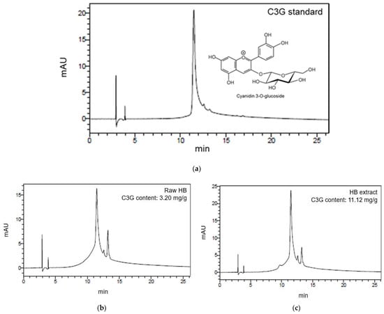 To determine C3G contents in raw HB and HB extract, HPLC analysis was performed. The main indicator and functional compound of HB extract is C3G, one of the anthocyanin HB [24]. As shown in Figure 2, the C3G content of HB extract was approximately three times higher than that of raw HB (11.12 mg/g and 3.20 mg/g, respectively).