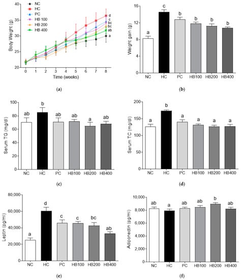 Effects of HB extract on body weight changes and serum biochemistry parameters. (a) Body weight; (b) weight gain; (c) serum TG; (d) serum TC; (e) leptin; and (f) adiponectin. NC, Normal diet Control; HC, HF diet control; PC, HF diet with orlistat 20 mg/kg; HB100, HF diet with honeysuckle berry extract at 100 mg/kg; HB200, HF diet with honeysuckle berry extract at 200 mg/kg; HB400, HF diet with honeysuckle berry extract at 400 mg/kg. Data are presented as mean ± SD (n = 8). Different letters indicate significant differences by one-way ANOVA (p < 0.05) followed by Duncan’s multiple range tests.