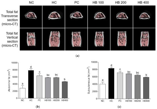 We analyzed micro-CT images to investigate the effect of HB on fat deposition and abdominal and subcutaneous fat volumes. As indicated in the pink area shown in the photographs of micro-CT (Figure 4a), fat deposition volume of the HC group in both transverse section and vertical section were higher than those of other groups. HB fed groups showed significantly reduced abdominal and subcutaneous fat volumes compared to the HFD only fed group (Figure 4b,c).