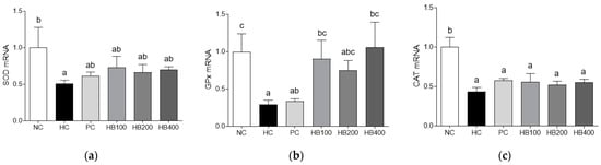 We assessed the expression of antioxidant enzymes. Results of mRNA expression analysis of antioxidant enzymes in high fat-fed mice revealed decreased expression levels of SOD, GPX, and CAT enzymes in the HC group than in the NC group, but increased expression levels in HB treated groups than in the HC group (Figure 5a–c).