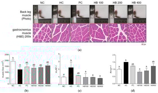 To evaluate the effect of HB on muscle mass and sizes of the hind limbs and gastro muscles, we performed a visual examination and H&E staining analysis (Figure 7a). Visual inspection analysis showed that the hind limb size was not clearly different among groups, although the hind limb sizes of HB200 group were bigger than those of other groups. Skeletal muscle atrophy is characterized by reduction in muscle mass and diameter of muscle fiber [26]. Histological examination results of gastrocnemius cross sections showed that the diameters of muscle fiber were greater in NC and HB groups than those of HC group. Muscle sizes were also lower in the HC group than in other groups. These differences were significant (Figure 7b).