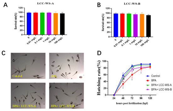 Effects of LCC-WS-A and LCC-WS-B on BPA toxicity in developing zebrafish. Survival rate following LCC-WS-A (A) and LCC-WS-B (B) treatment. Representative images of the hatched zebrafish larvae in different treatment groups at 72 hpf (C). Statistical results of the hatching rate of zebrafish (D). * p < 0.05, compared with the control group. # p < 0.05, compared with BPA-treated group.