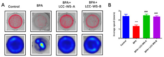 To investigate effects on the locomotor behavior, zebrafish larvae were treated with BPA, BPA + LCC-WS-A, and BPA + LCC-WS-B for 6 days. The locomotor behavior of zebrafish larvae in the BPA-treated group (1.34 mm·s−1) was significantly inhibited compared with that of zebrafish larvae in the control group (2.44 mm·s−1) (Figure 3). However, the co-treatment of BPA + LCC-WS-A and BPA + LCC-WS-B significantly restored the abnormal locomotor behavior of zebrafish larvae caused by BPA to the control level. Specifically, the average speed during moving time was 2.52 mm·s−1 in the LCC-WS-A-treated group and 2.37 mm·s−1 in the LCC-WS-B-treated group, indicating that LCC-WS-A was more effective than LCC-WS-B in restoring the BPA-altered locomotor behavior of zebrafish.