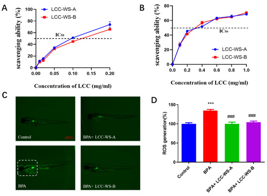 In vivo antioxidant properties of the LCC preparations were determined based on their scavenging activity against ROS in the BPA-treated zebrafish. Specifically, zebrafish were exposed to different treatments (control, BPA, BPA + LCC-WS-A co-treatment group and BPA + LCC-WS-B co-treatment group) for 6 days. Following staining with the diluted fluorescent probe 2-dichlorodihydrofluorescein diacetate at 28 °C for 20 min and washing with PBS three times, the fluorescence intensity was measured by confocal microscopy (Nikon, A1RHD25, Tokyo, Japan).