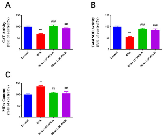 Effects of LCC-WS-A and LCC-WS-B on BPA-induced oxidative stress in zebrafish. LCC-WS-A and LCC-WS-B increased the activity of CAT (A) and SOD (B) but decreased the content of MDA (C). ** p < 0.01, *** p < 0.001, compared with the control group. ## p < 0.01, compared with BPA-treated alone. ### p < 0.001, compared with BPA-treated alone.