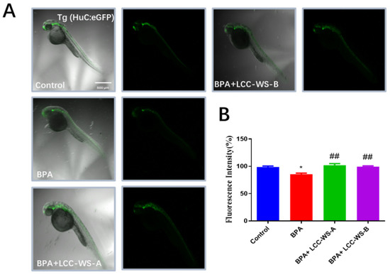 Effects of LCC-WS-A and LCC-WS-B on neurogenesis in Tg (HuC-GFP) zebrafish. Green fluorescence images of neurogenesis in 72 hpf Tg (HuC-GFP) zebrafish (A) and statistical analysis of fluorescence (B) (n = 10 in each group). * p < 0.05, compared with the control group. ## p < 0.01, compared with the BPA-treated group.