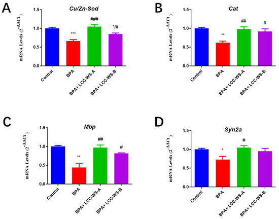Effects of LCC-WS-A and LCC-WS-B on the expression of oxidative stress- and neurogenesis-related genes in BPA-treated zebrafish. Cu/Zn-Sod (A), cat (B), mbp (C) and syn2a (D). * p < 0.05, ** p < 0.01, *** p < 0.001, compared with control groups. # p < 0.05, ## p < 0.01, ### p < 0.001, compared with the BPA-treated group.