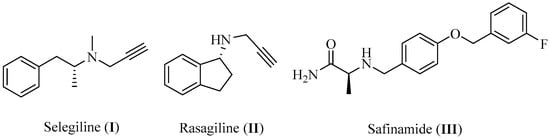 - Youdim, M.B.; Gross, A.; Finberg, J.P. Rasagiline [N-propargyl-1R(+)-aminoindan], a selective and potent inhibitor of mitochondrial monoamine oxidase B. Br. J. Pharm. 2001, 132, 500–506. [Google Scholar] [CrossRef] [PubMed]