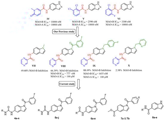 The indole scaffold is considered one of the most privileged heterocyclic motifs among those attracting the attention of medicinal chemists and has become a center of research due to its unique pharmacological properties, with anticancer, anti-inflammatory, and antimicrobial applications [13,14,15]. As a continuation of our efforts to develop new small molecules as potential candidates for neurodegenerative disorders [16,17], we recently generated new indole-based MAO-B inhibitory leads [18] from previously reported indazole derivatives (IV, V, and VI, Figure 2) [19]. In our previous study, the indole-based compound VIII bearing N-1-(3-fluorobenzoyl) moiety was found to be the most active MAO-B inhibitor with 66.39% inhibition at a single dose concentration of 10 μM. Compound VIII also exhibited a far better profile in terms of potency and selectivity, with an IC50 value in the submicromolar range (777 nM) and selectivity index (SI > 120), which was slightly better than rasagiline II (SI > 50). Based on these promising results, we designed thirty novel indole-based analogs in a trial to further optimize the scaffold aiming to afford more potent derivatives, identify their mode of interaction in addition to their kinetic properties. Our design was based on keeping the N1 positioned (3-fluorobenzoyl) moiety of VIII, which led to a better overall inhibitory profile compared to other derivatives of the same series. Four different classes (amides, ureas, thioureas, and esters) were obtained by introducing various linkers to C5 of the indole core. The synthesized library was obtained by replacing the pyrazinyl heterocyclic ring of VIII with different alkyl and aryl substitutions. Furthermore, we added five more compounds based on a free NH indole scaffold while keeping the C5 amide linker. Accordingly, thirty novel compounds were obtained (4a–n, 5a–j, 6a–e, 7a, 7b, and 8a–e); among them, compounds 7b, 8a, 8b, and 8e exhibited nanomolar activity over MAO-B and successfully attenuated the induced-oxidative stress in PC12 cells. Moreover, kinetic studies and molecular docking simulations indicated a competitive and reversible mechanism of action of these new MAO-B inhibitors.