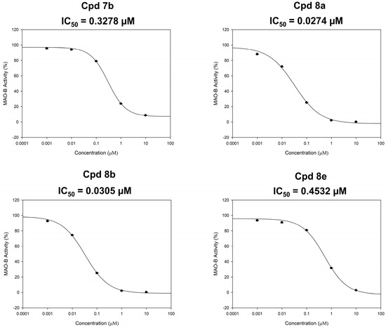 6-OHDA-induced cell-based model is a widely used model for evaluating the neuroprotective potential of substances [35,36,37,38,39]. After cellular absorption, 6-OHDA causes dopaminergic neurotoxicity by generating reactive oxygen species (ROS), which contributes to cell death. As a result, the protective effects of the test compounds on the 6-OHDA-induced cytotoxicity in PC12 cells were assessed using the MTT assay. The viability of cells incubated with 50 μM of 6-OHDA was reduced to 47.5 ± 1.2%, compared to that of control cells (Figure 11). Pretreatment with the test compounds at various concentrations for 4 h significantly attenuated the cytotoxicity induced by 6-OHDA (Figure 11). The decreased cell viability by 6-OHDA was maximally increased by compounds 7b and 8a to 64.5 ± 2.1 and 75.8 ± 3.4%, respectively, at 30 μM concentration. Meanwhile, 8b and 8e exerted their maximal protective effects at 10 μM concentration, raising the cell viability up to 72.6 ± 4.1 and 71.3 ± 1.2%, respectively. Rasagiline also increased the cell viability up to 67.9 ± 2.8% at the same concentration. These findings indicate that compounds 7b, 8a, 8b, and 8e exhibit protective effects against 6-OHDA-induced cytotoxicity in PC12 cells. Their maximal protective effects were comparable or slightly better than that of rasagiline (Figure 11).