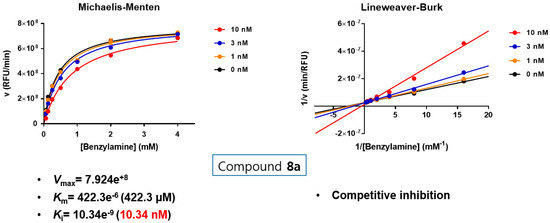 The higher activity of the 3,4-dichlorophenyl derivatives (as compared to the alkyl substituents) occurs because of favorable π-π stacking interactions with Tyr398 and Tyr435, which are sometimes referred to as the “aromatic cage” [31] (Figure 8). The role of the linkers, in this case, is to correctly position the benzene ring for optimal interactions. The thiourea compound 5i (docking score −11.266) in this case is the most active, compared to 4j (docking score −10.616) and 6d (docking score −10.679), since it forms additional π-sulfur interactions with Phe343 and Tyr326. However, it seems that the pyrazinyl heterocyclic ring of compound VIII may be more favorable, since it forms not only π-π stacking interactions but also H-bonds with the nearby tyrosine residues [18].