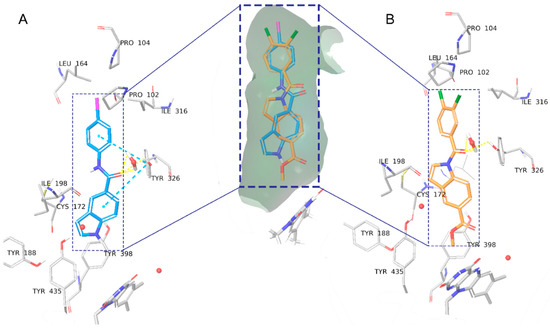 Binding modes of compounds 8a (A) and 7b (B) in the binding pocket of MAO-B. Water molecules are shown as red spheres, with explicit hydrogens shown only when involved in hydrogen bonds. H-bonds are shown with yellow dashed lines, π-π interactions are shown as sky blue dashed lines.
