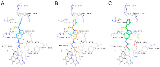 Binding modes of reference benzofuran compound [32] (A), 8a (B), and 7b (C) in the binding pocket of MAO-A. Water molecules are shown as red spheres. H-bonds are shown with yellow dashed lines, π-π interactions are shown as sky blue dashed lines, halogen interactions are shown as purple dashed lines.