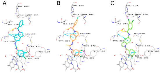 Binding modes of compounds 4a (A), 5a (B), and 6b (C) in the binding pocket of MAO-B. Water molecules are shown as red spheres, with explicit hydrogens shown only when involved in hydrogen bonds. H-bonds are shown with yellow dashed lines, π-π interactions are shown as sky blue dashed lines.