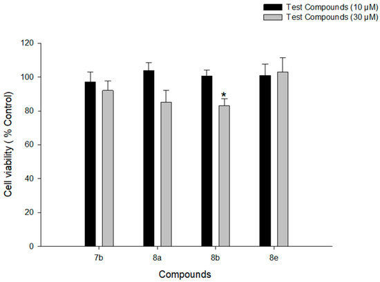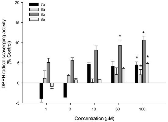 DPPH radical scavenging activities of the test compounds. A cell-free bioassay was performed as described in the Materials and methods to assess DPPH radical scavenging activities of compounds 7b, 8a, 8b, and 8e at the indicated concentrations. Data are expressed as the mean ± SEM of three independent experiments. * p < 0.05 vs. vehicle-treated control.
