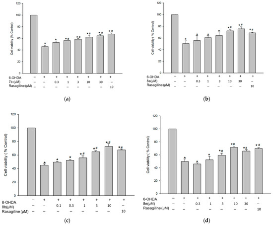 Inhibition of 6-OHDA-induced cytotoxicity by the test compounds in PC12 cells. PC12 cells were pre-treated for 4 h with compound 7b (a), 8a (b), 8b (c), and 8e (d) or rasagiline at the indicated concentrations and subsequently exposed to 6-OHDA (50 μM) for an additional 24 h. Cell viability was evaluated by MTT assay as described in the Materials and methods. Data are expressed as the mean ± SEM of at least three independent experiments. * p < 0.05 and # p < 0.05 vs. the vehicle-treated control and 6-OHDA-treated cells, respectively. 6-OHDA, 6-hydroxydopamine.